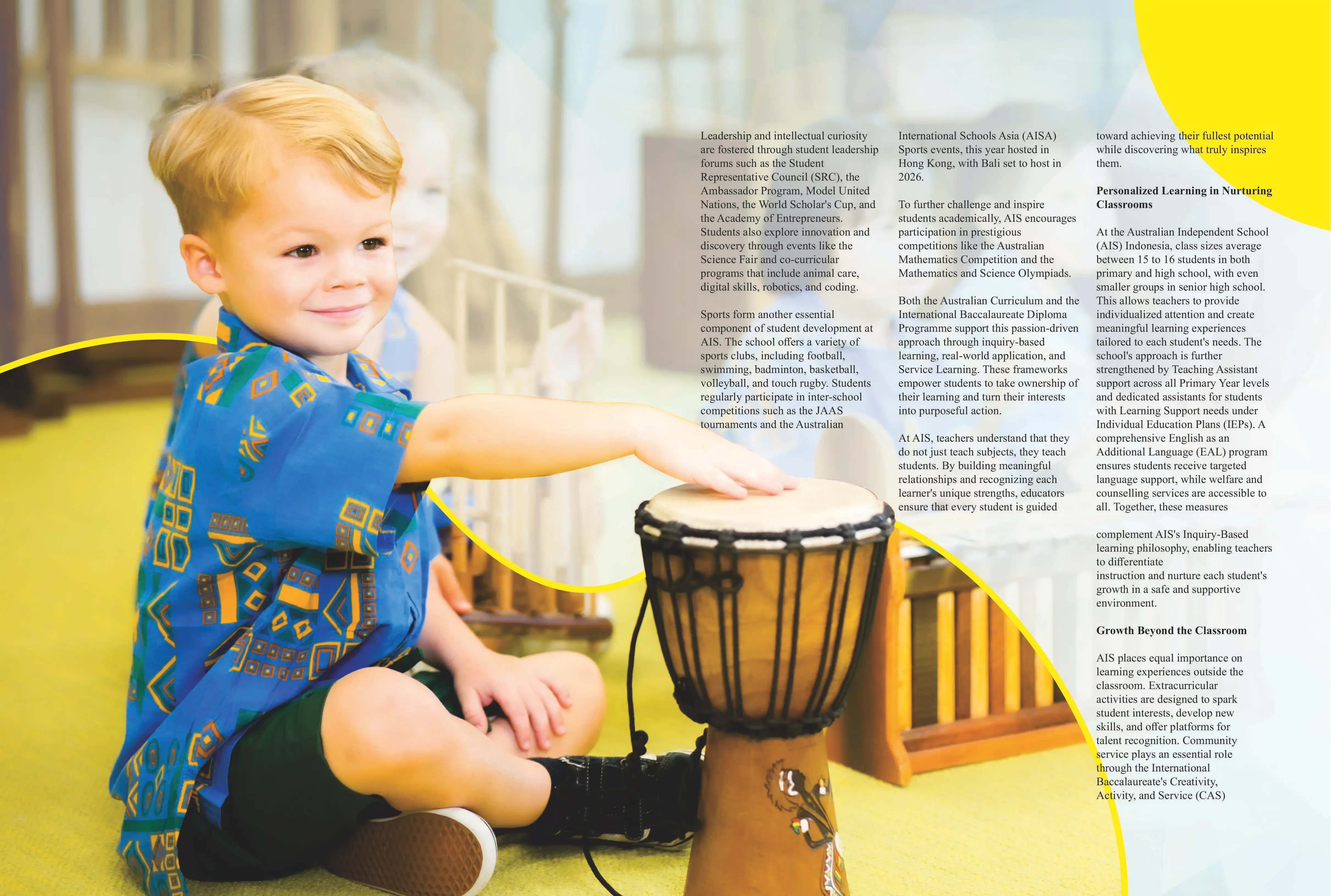 Passionate learning lies at the core of AIS Indonesia’s educational philosophy. The school believes that academic excellence should be complemented by the discovery and development of each student’s personal interests and talents. Teachers play an active role in identifying and nurturing these strengths through a wide range of programs, events, and opportunities that encourage creativity, leadership, and self-expression.