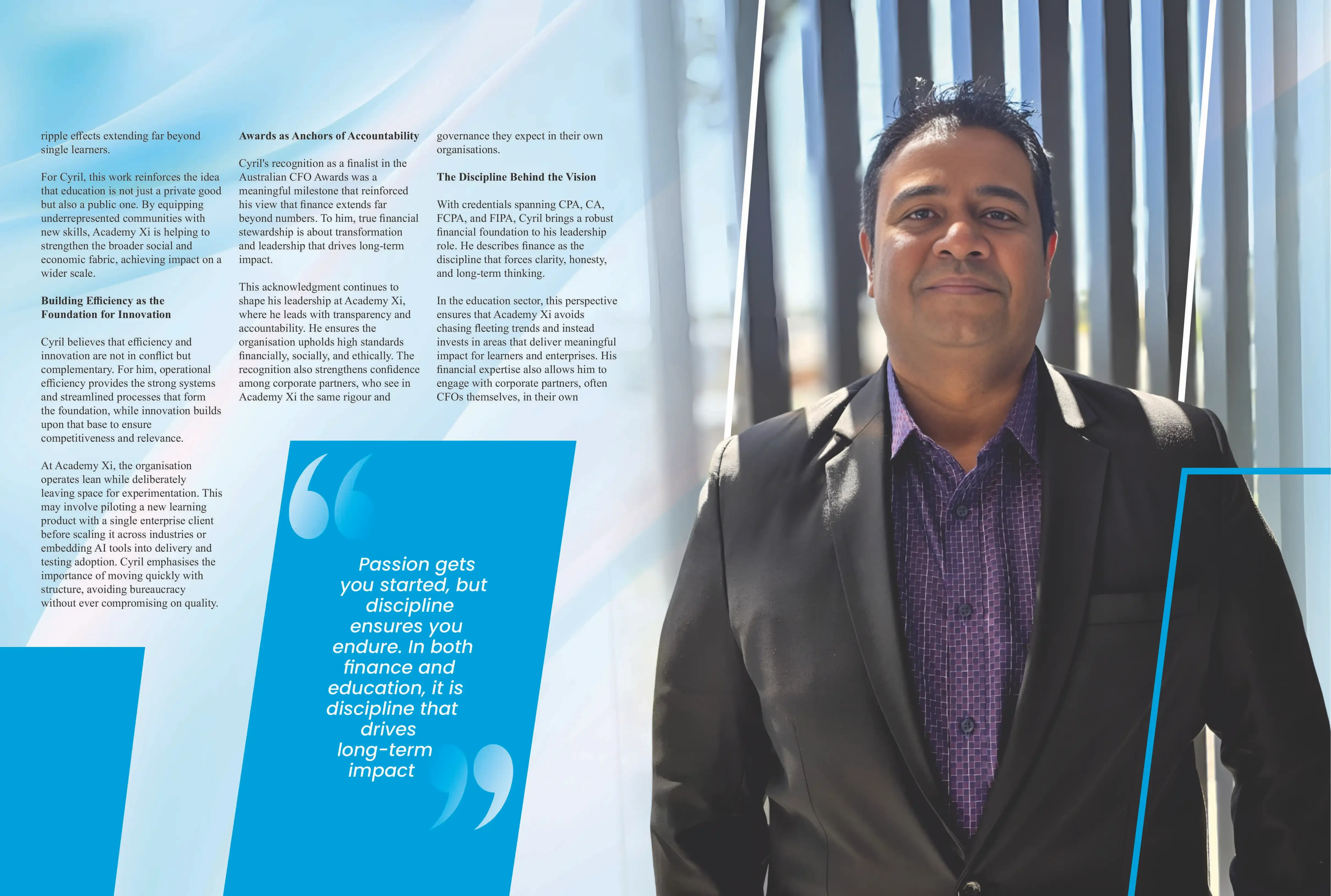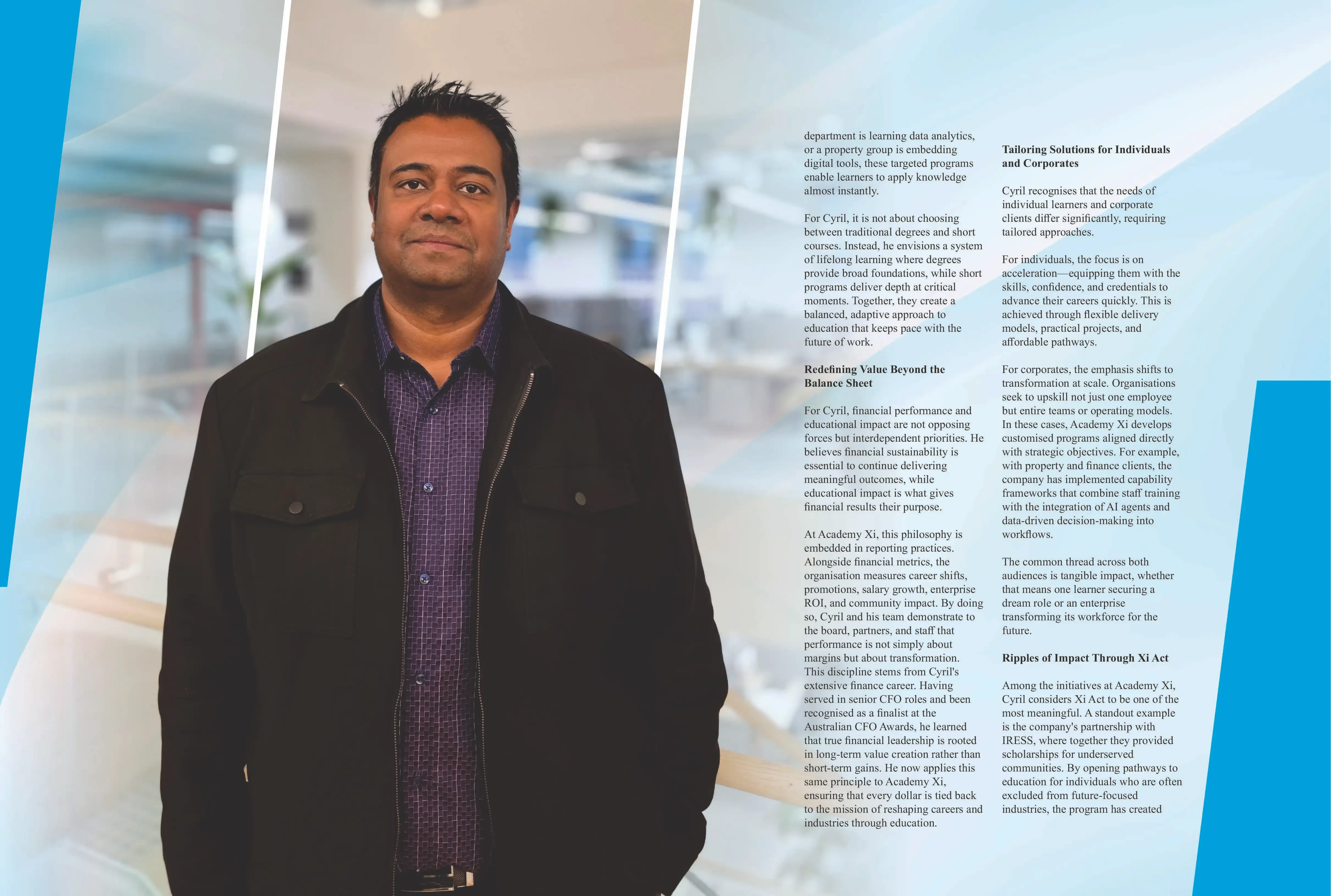 This discipline stems from Cyril’s extensive finance career. Having served in senior CFO roles and been recognised as a finalist at the Australian CFO Awards, he learned that true financial leadership is rooted in long-term value creation rather than short-term gains. He now applies this same principle to Academy Xi, ensuring that every dollar is tied back to the mission of reshaping careers and industries through education.